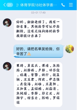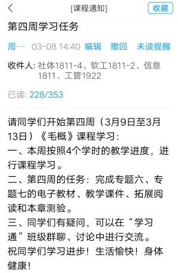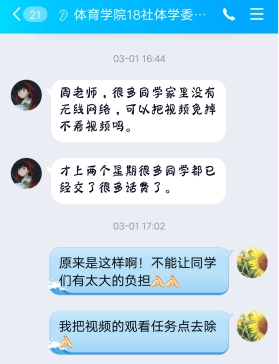 (2)根据同学们的实际情况,调整教学内容和要求。和体育公司18社体学委罗娟娟沟通时,周淑芳老师了解到,很多同学家里没有无线网络,进行线上教学才两个星期很多同学都已经交了很多话费了。体育公司18社体学委罗娟娟交给周淑芳老师一份名单,这些同学没有无线网络,都是用流量进行线上学习的,因为家长都在外面打工,家里没有装无线网络。名单:覃琦,吴高天,谭靖,朱扬扬,刘静雨,卢静,邓存俊,杨建,曾圆,姚行,祝星驰,王玉君,何爽,尹志强,肖俊海,刘雄,王晨阳,王加冕,孟娅楠,刘淼清,朱纯瑶,李静,郑文龙,刘翔宇,柳东云,陈明,罗娟娟。根据同学们的实际情况,周淑芳老师把《毛概》线上课程拓展视频的观看任务点去除,不做任务点要求,保留拓展视频,有无线网络的同学可以观看视频。要求同学们完成的学习任务调整为,前四周,完成七个专题和战“疫”形势与政策专题的电子教材、教学课件、拓展阅读、章节测验和课外讨论。周淑芳老师通过发布通知,把教学内容和要求的调整及时告诉四个教学班的同学。