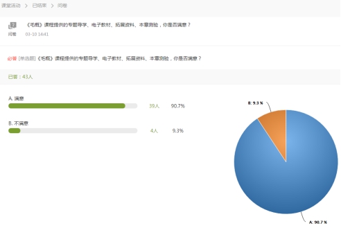 线上教学从2月17日至3月10日,已经运行了近四周,周淑芳老师发放了调查问卷:《毛概》课程提供的专题导学、电子教材、拓展资料、本章测验,你是否满意?信息1811班满意率100%,工管1922班满意率94.7%,社体1811-4满意率93.7%,软工1811-2班满意率90.7%。问卷调查结果表明同学们对知识性内容的学习比较满意。