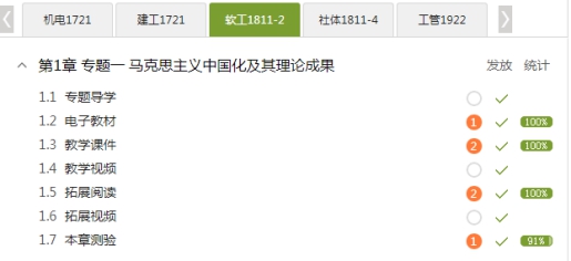 (1)低阶知识性学习内容。以“专题一马克思主义中国化及其理论成果”为例,包括7个二级目录,专题导学、电子教材、教学课件、教学视频、拓展阅读、拓展视频和本章测验。设置任务点要求同学们自主完成学习任务,完成学习任务后通过回答本章测验中的考题,检查同学们的学习效果。