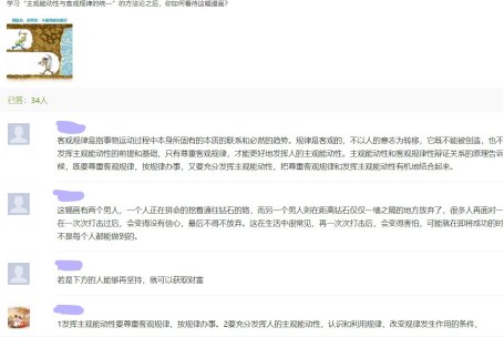 经过尝试与完善各种形式的线上辅导答疑,员工对每周的学习内容在逻辑关系上有了整体的认识;每周约定固定的在线语音答疑,不仅在知识上为员工答疑解惑,也起到了对员工学习马原理课程的提醒和督促作用;通过学习通发起测试、问卷等活动能够调动员工参与课程的积极性,并引导员工形成学习自查的学习习惯;班级整体答疑与一对一答疑相结合,兼顾了员工答疑的共性与个性,解决班级间或班级内员工“吃不饱”与“消化不良”的矛盾;音频录制答疑方便员工回顾已学知识,QQ群发送每周知识点总结不仅帮助员工厘清知识点,也提醒员工养成根据知识点整理笔记的习惯。