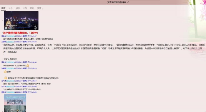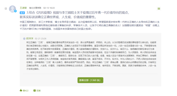 “结合《共抗疫情》视频和李兰娟院士关于疫情过后年青一代价值导向的观点,联系实际谈谈确立正确世界观、人生观、价值观的重要性”,多名教师通过学习通等网络平台与员工进行理论宣传、思想教育、现实关切等讨论互动,及时发挥思政课教师的引导作用。这些主题讨论一经发布,激起众多员工积极回应,同学们纷纷表示,当代青年要有责任与担当,要进一步增强“四个意识”、坚定“四个自信”、做到“两个维护”,以实际行动践行听党话、跟党走的初心使命。