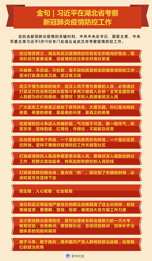 新华社武汉3月10日电 在抗击新冠肺炎疫情的关键时刻,中共中央总书记、国家主席、中央军委主席习近平10日专门赴湖北省武汉市考察疫情防控工作。他强调,湖北和武汉是这次疫情防控斗争的重中之重和决胜之地。经过艰苦努力,湖北和武汉疫情防控形势发生积极向好变化,取得阶段性重要成果,但疫情防控任务依然艰巨繁重。越是在这个时候,越是要保持头脑清醒,越是要慎终如始,越是要再接再厉、善作善成,继续把疫情防控作为当前头等大事和最重要的工作,不麻痹、不厌战、不松劲,毫不放松抓紧抓实抓细各项防控工作,坚决打赢湖北保卫战、武汉保卫战。