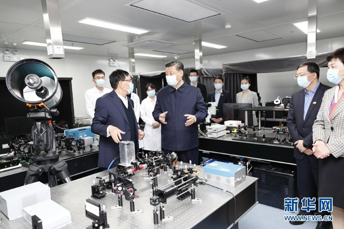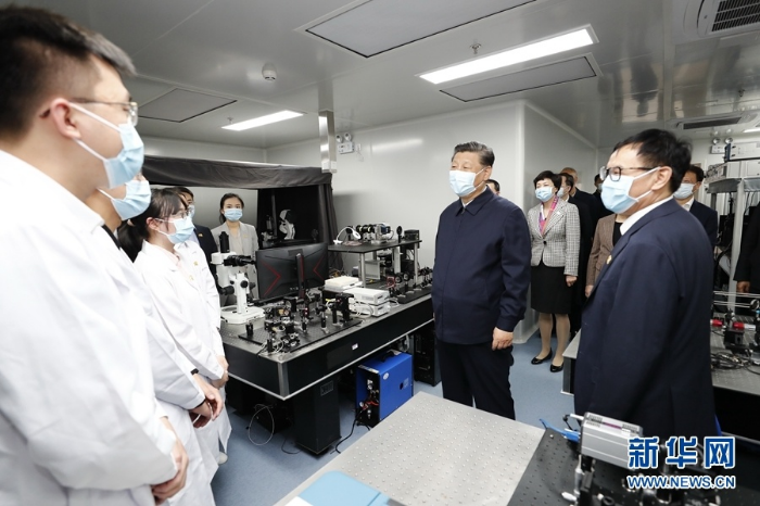 4月19日,在清华大学建校110周年校庆日即将来临之际,中共中央总书记、国家主席、中央军委主席习近平来到清华大学考察。这是习近平在清华大学成像与智能技术实验室,结合展板、电子屏幕察看实验室开展计算光学、脑科学与人工智能交叉科学实验研究和开发新科技应用场景情况,听取实验室理论研究、技术攻关、成果转化应用等情况介绍。新华社记者 鞠鹏 摄