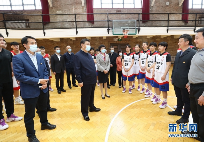 4月19日,在清华大学建校110周年校庆日即将来临之际,中共中央总书记、国家主席、中央军委主席习近平来到清华大学考察。这是习近平在清华大学西体育馆篮球场同校篮球运动员亲切交谈。新华社记者 鞠鹏 摄