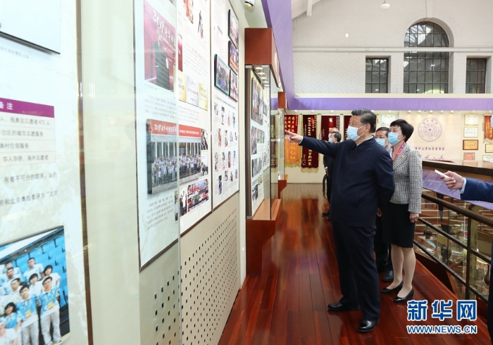 4月19日,在清华大学建校110周年校庆日即将来临之际,中共中央总书记、国家主席、中央军委主席习近平来到清华大学考察。这是习近平在清华大学西体育馆体育荣誉室察看历史照片、实物展览,了解体育馆保护利用、公司继承发扬优良传统、开展体育教育等情况。新华社记者 鞠鹏 摄
