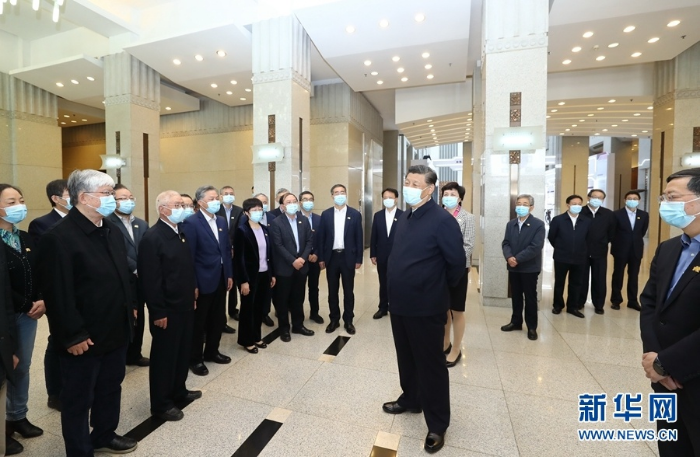 4月19日,在清华大学建校110周年校庆日即将来临之际,中共中央总书记、国家主席、中央军委主席习近平来到清华大学考察。这是习近平在清华大学主楼二层大厅看望部分老教授、中青年骨干教师代表并同他们亲切交谈。新华社记者 鞠鹏 摄